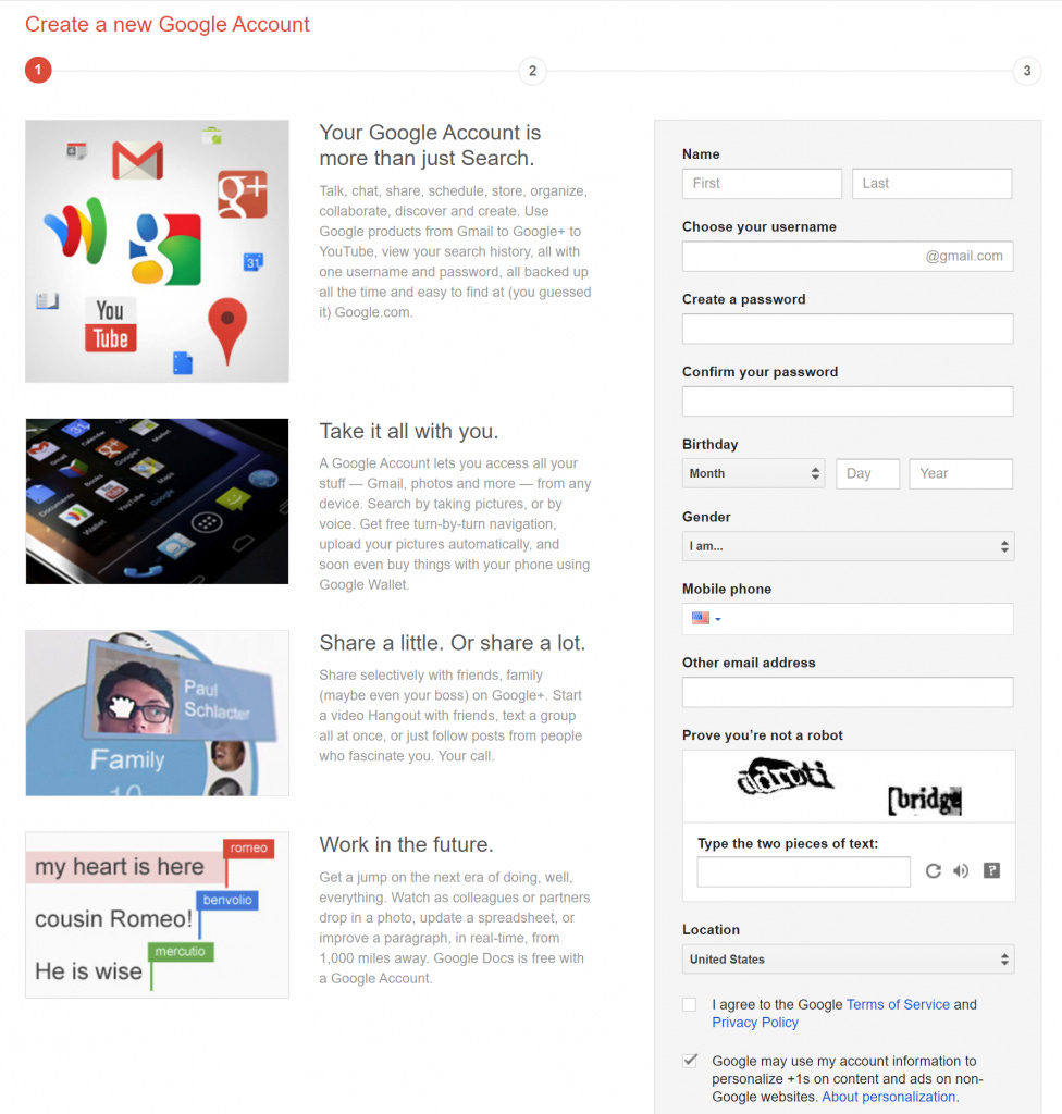 The number of fields has increased. On the screen, we can see questions about location and “Personalized Search.” This set of fields existed for a very long time, and I still associate the Google signup form with it.
