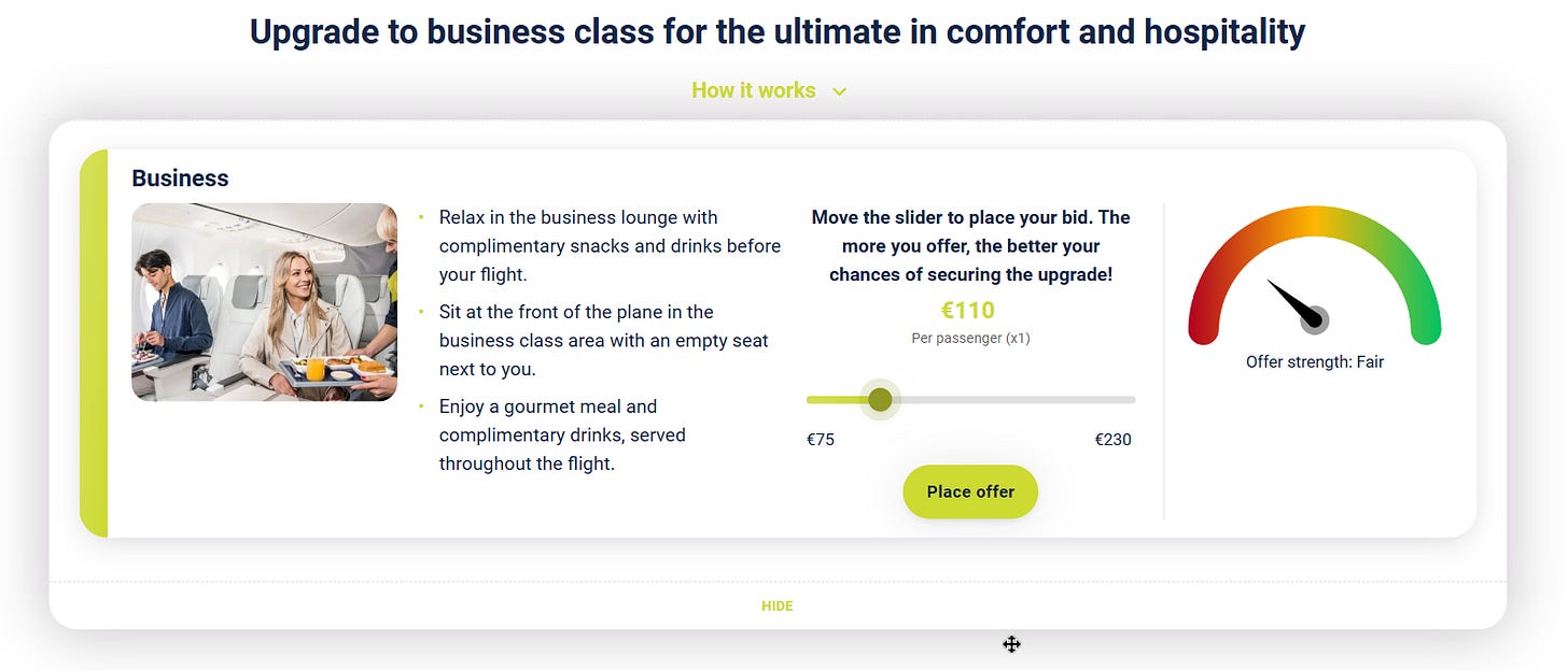 Note, they do not try to make a direct upsell like “Pay additional 100 euro for business class“. They invite you to place an offer, challenging you to guess other people’s offers and promising a relatively cheap upgrade as a reward in case you are right. And don’t forget the sweet feeling of you outsmarting the system if you won with the minimal bet!